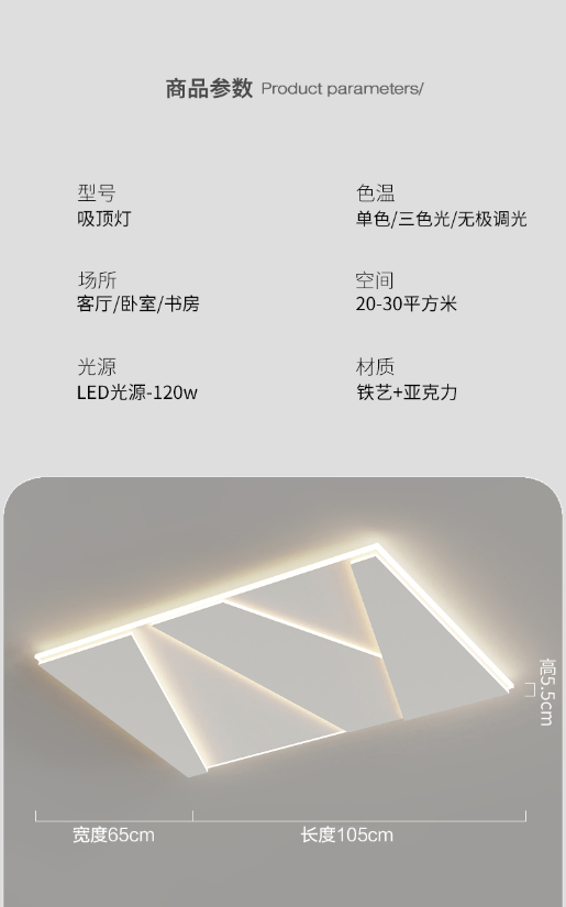 Home Light CEILING LAMP CEILING LAMP Categories Light Model Number LI -97 -HC2132 Material / 材质 STEEL / PIPE ACRYLIC Size / 规格 (L x W x H) 105 * 65 * 5.5 CM / 120W M3 / 立方数 0.05 Remarks Related products OUTDOOR LAMP Light OUTDOOR LAMP Light OUTDOOR LAMP Light BEDSIDE LAMP Light